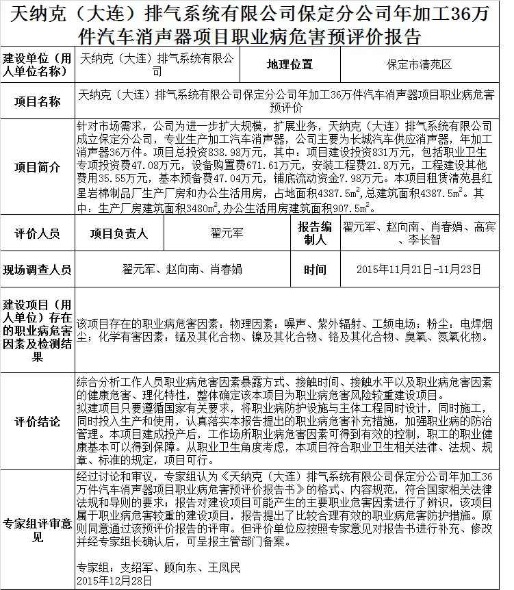 天纳克(大连)排气系统有限公司保定分公司年加工36万件汽车消声器项目职业病危害预评价